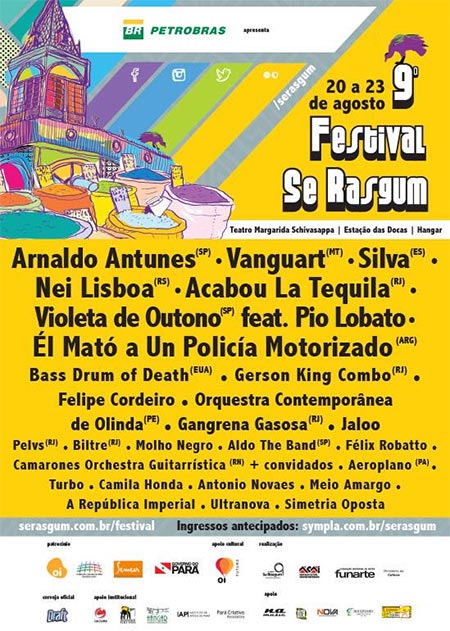 Depois de muita espera, finalmente foi anunciado o line up completo do 9º Festival Se Rasgum, que este ano teve sua programação adiantada e acontece entre os dias 20 e 23 de agosto. São 27 atrações que se apresentam em três locais de Belém – Teatro Margarida Schivasappa, Estação das Docas (dia gratuito) e Centro de Convenções e Feiras da Amazônia – HANGAR. No time do Festival este ano estão grandes nomes consagrados e em ascensão da música brasileira e internacional, como Arnaldo Antunes, Vanguart, Silva, , os argentinos do El Mató a un Policía Motorizado e os norte-americanos do Bass Drum of Death. O evento também contará com as bandas Acabou La Tequila, Pelvs, Gangrena Gasosa, Gerson King Combo, Nei Lisboa, Violeta de Outono, Biltre e Orquestra Contemporânea de Olinda. A ULTRANOVA irá se apresentar numa noite aberta ao público na Estação das Docas, quinta-feira 21/08. Confira a programação completa do evento: