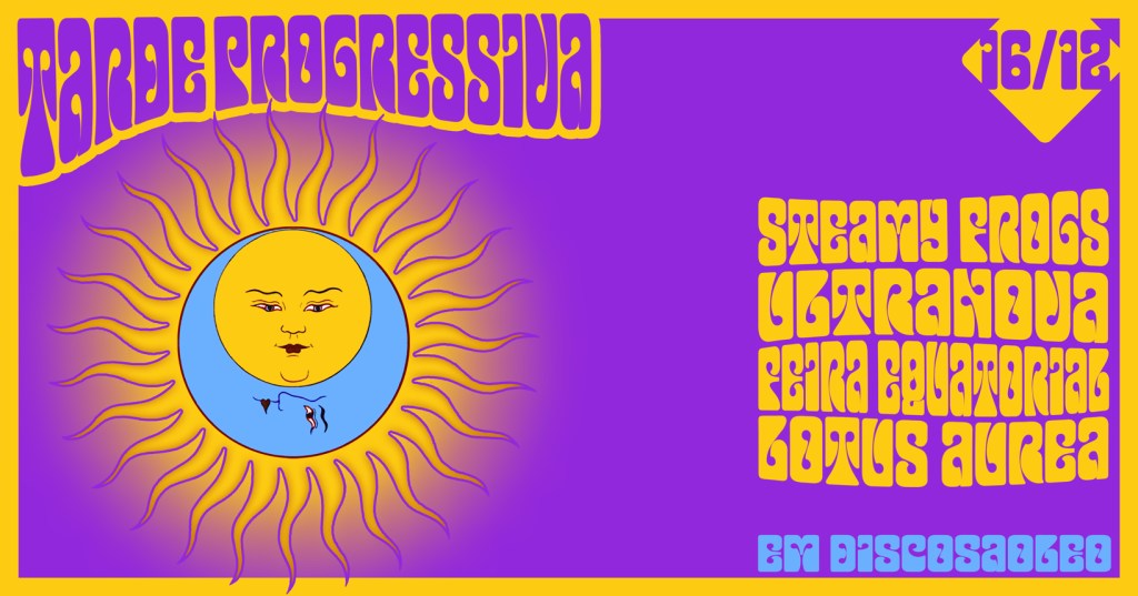 Influenciada por Larks Tongue in Aspic do King Crimson, a Tarde Progressiva apresenta a sua segunda sessão pra repetir a sonzeira da primeira e dessa vez convidando a Feira Equatorial pra adicionar um art-rock recheado de clube da esquina no line-up, e as já tradicionais bandas organizadoras do evento: Ultranova, Steamy Frogs e Lótus Áurea. Tudo isso num lugar muito bem apropriado para ouvir um som: uma loja de LPs no coração da Cidade Velha, a loja Discosaoleo (Trav. Campos Sales, 628).