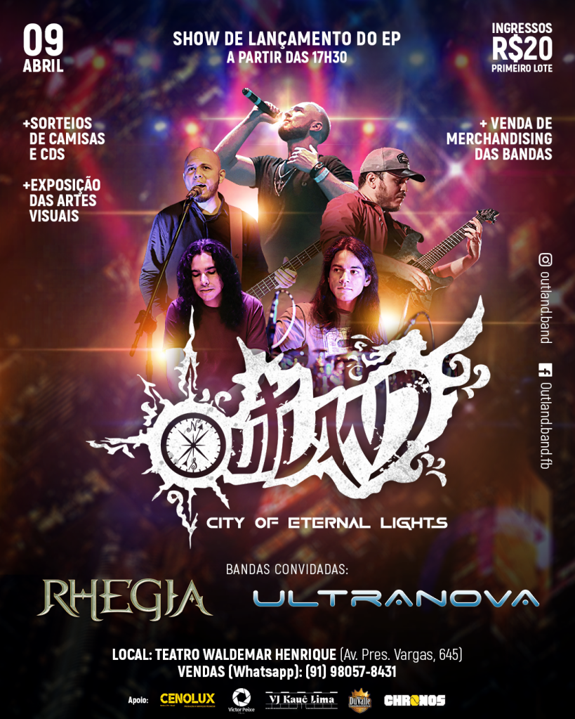 Domingo 09 de abril, a Outland convida a todos para o lançando de seu primeiro EP intitulado “City of Eternal Lights”. Nós da ULTRANOVA temos a honra de fazer deste dia tão especial juntamente com os amigos da Rhegia, quando estaremos dividindo o palco do Teatro Waldemar Henrique para fazer essa grande celebração musical no lendário palco do rock paraense.